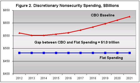 Figure 2 shows the non-security portion of discretionary spending, which is roughly total discretionary spending less defense and homeland security. The top line shows CBO baseline spending, which initially dips as “stimulus” funding peters out, then starts rising again with assumed inflation.