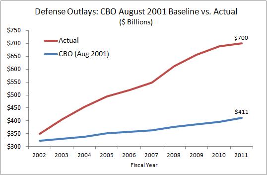 The following chart illustrates why it is ridiculous to act as if smaller future increases in projected spending amount to realized spending cuts. The chart shows the Congressional Budget Office’s August 2001 baseline estimate of defense spending from 2002 to 2011 versus the actual outlays: