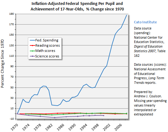 Trying to run the nation’s schools from Washington has failed. Andrew Coulson’s chart shows that federal education spending has gone through the roof while k-12 test scores have remained flat: