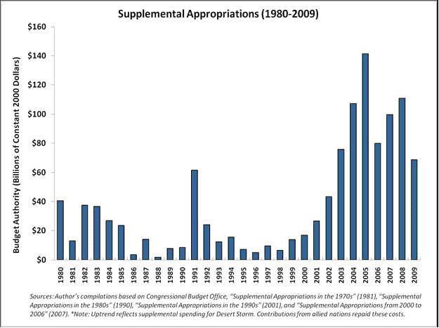 The following chart from the paper shows how supplemental spending, most of which was designated as “emergency,” has taken off in the last decade: