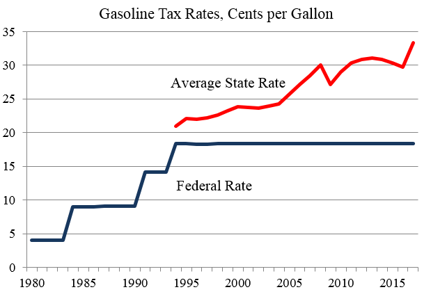Supporters of a federal gas tax hike say that the tax has not been raised since 1993, and its real value has been eroded by inflation. That is true. But the federal gas tax rate more than quadrupled between 1983 and 1993 from 4 cents to 18.4 cents, as shown in the chart below. The 4-cent rate would be 9.8 cents in today’s dollars, so the real gas tax rate has risen substantially since the early 1980s.