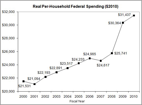 The following chart show federal spending over the past decade on a per-household basis, adjusted for inflation: