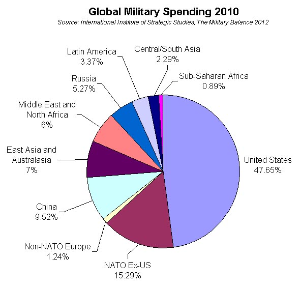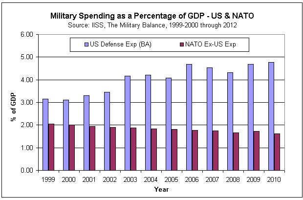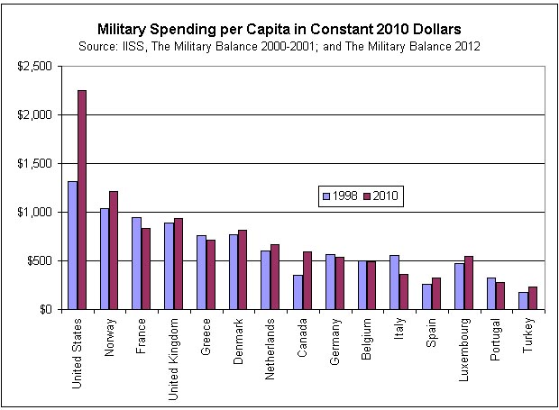 The data demonstrates that Americans in 2010 spent vastly more in every sense of the term. We accounted for 47.65 percent of global security spending. We each spent more than $2,200 on the Pentagon’s budget, and hundreds more when you factor in other security spending (e.g. Homeland Security, Veterans Affairs, and nuclear weapons). That represents a 72 percent increase in real, inflation-adjusted dollars since 1998, whereas the United Kingdom and Denmark increased by five and six percent, respectively. Six NATO countries saw per capita spending decline: Italy’s has fallen by 35 percent since 1998; France by 14 percent; and 12 percent in Portugal. The aggregate numbers paint a similar picture: between 1999 and 2010, U.S. spending as a share of GDP rose from 3.15 to 4.77, whereas the rest of NATO declined from 2.05 to 1.61 percent.