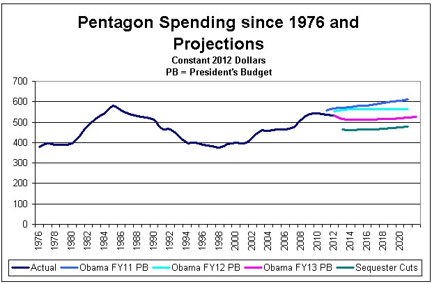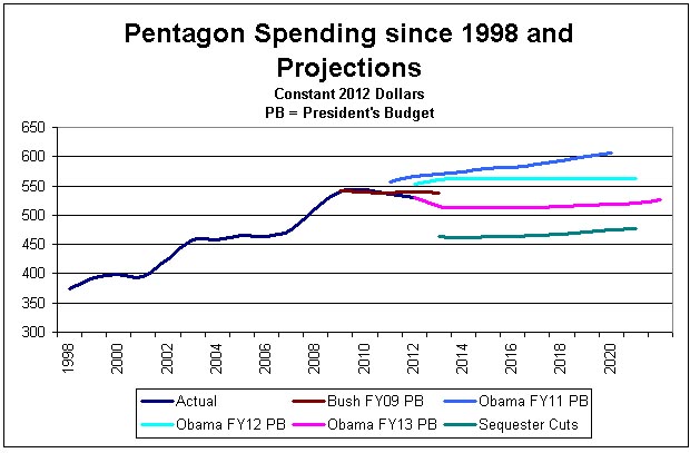 The first shows that the Pentagon’s budget, according to the Obama administration’s projections, will average $517 billion over the next decade, slightly more than what we spent in 2008 ($511 bn), and 38 percent more than we spent in 1998 ($375 bn).