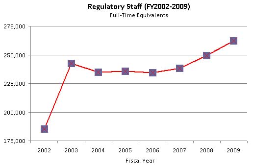 Similarly, regulatory staff jumped by 42 percent under Bush’s watch: