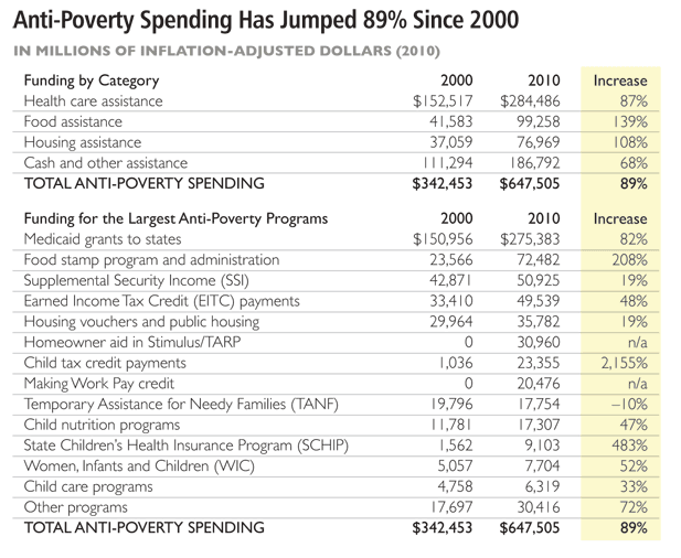 Moreover, while TANF has successfully reduced the budgetary cost of cash-welfare, overall federal spending on anti-poverty programs has increased dramatically. According to a chart from Brian Riedl, anti-poverty spending has increased an inflation-adjusted 89 percent over the present decade: