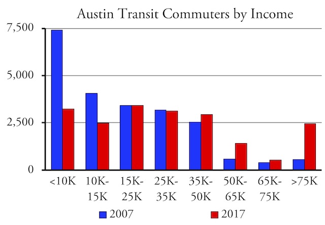 Though the number of high-income transit commuters is small – fewer than 2,500 transit commuters in 2017 earned more than $75,000 a year – that is the only growth market for Austin transit. As a result, according to table B08121, the median income of transit riders grew by 85 percent between 2007 and 2017, while the median income of the region as a whole grew by only 49 percent.