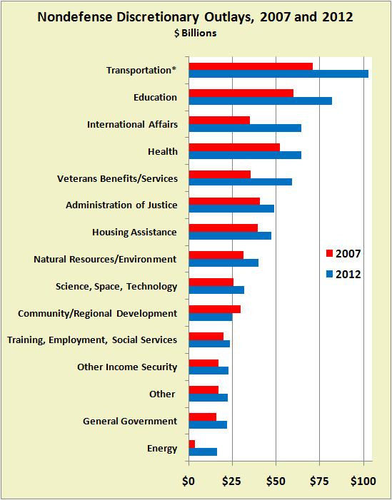 Last week I compared “other mandatory” spending in fiscal 2007 to the president’s proposal for fiscal 2012. Several readers requested that I produce a chart showing a similar breakdown for nondefense discretionary spending (or “domestic discretionary”).