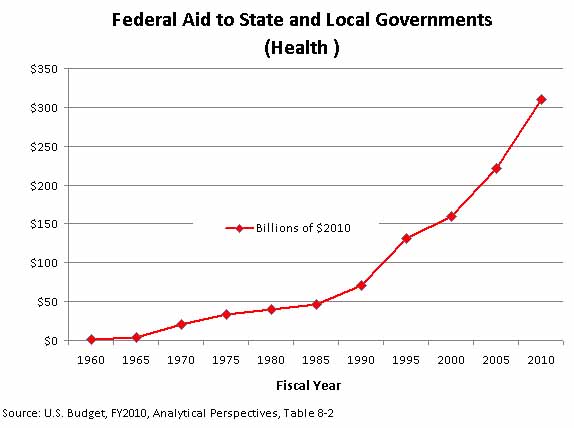 Several readers have asked me what particular programs account for this large increase in state aid. The federal budget breaks down the total figures into categories. Not surprisingly, health subsidies – mainly Medicaid – account for almost half of the current total and are the driving force behind the massive overall increase: