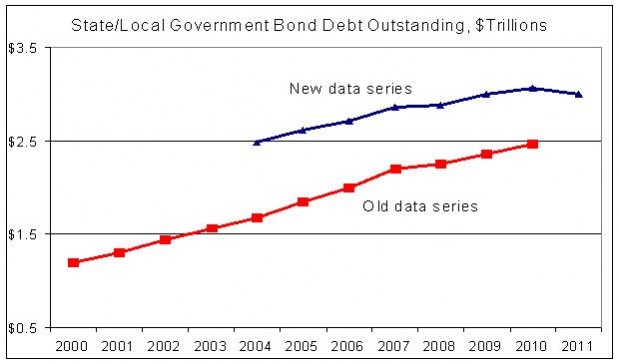 The old Fed data (Table D.3) show state/local debt growing from $1.2 trillion in 2000 to $2.5 trillion in 2010. The new data (Table D.3) show debt hitting $3.1 trillion in 2010 and then falling a bit to $3.0 trillion in 2011. By the way, Census data show that state/local government debt grew from $1.5 trillion in 2000 to $2.7 trillion in 2009.