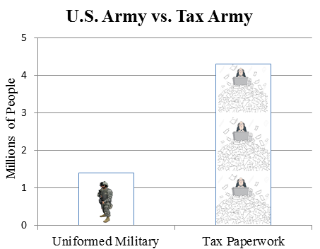 Individuals and businesses spend 8.9 billion hours a year on federal tax paperwork, which is equivalent to 4.3 million people working full-time and year-round on this unproductive activity. That “tax army” is three times larger than our uniformed military of 1.4 million active duty service members.