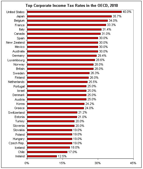 The chart shows KPMG data on statutory corporate tax rates in the OECD for 2010, but I’ve also put in the new lower rate for Japan. With the Japanese reform, the average rate in the OECD will be 25.6 percent. That means that the 40 percent U.S. rate is 56 percent higher than the wealthy-nation average.