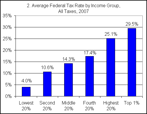 Chart 2 shows CBO data for 2007 on average effective tax rates, including essentially all federal taxes—individual income, corporate income, payroll, and excise. Buffett’s secretary would fit into the fourth group in the chart, where the average tax rate was 17.4 percent. So if she is really paying 30 percent, then Buffett needs to show her some of his tax-reduction tricks. Note in the chart that Buffett’s peers in the top 1 percent paid an average rate of 29.5 percent, which is double the rate paid by middle-income taxpayers.